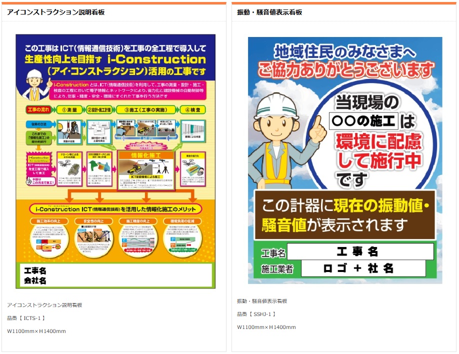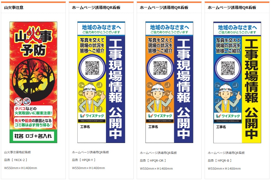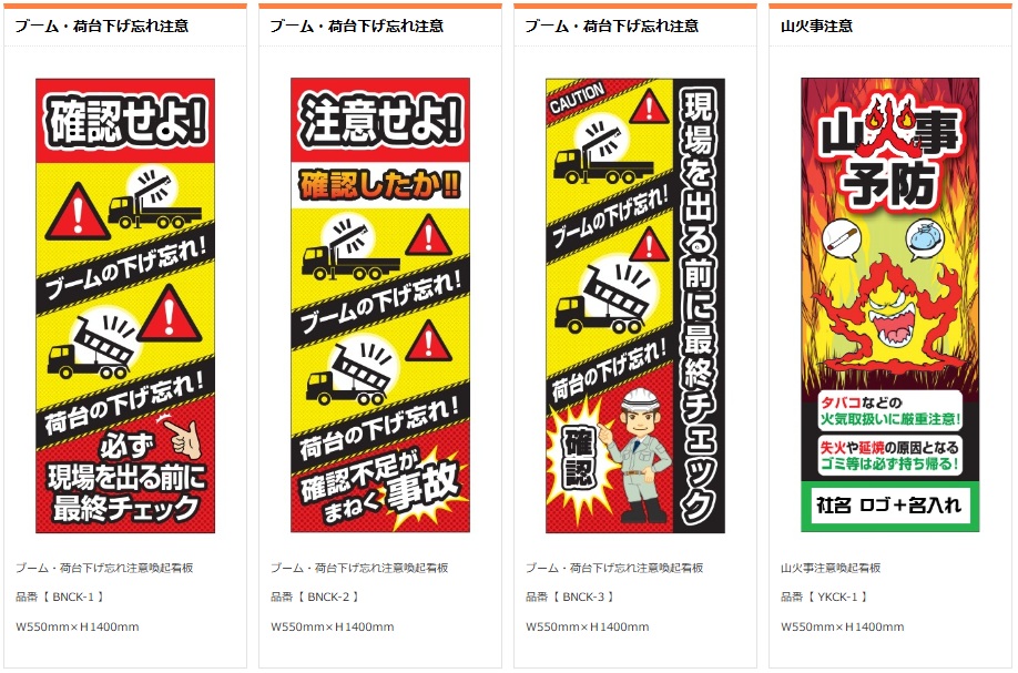 当社のオリジナル既製デザイン看板や安全サイン(のぼり旗・横断幕など)のラインナップです。